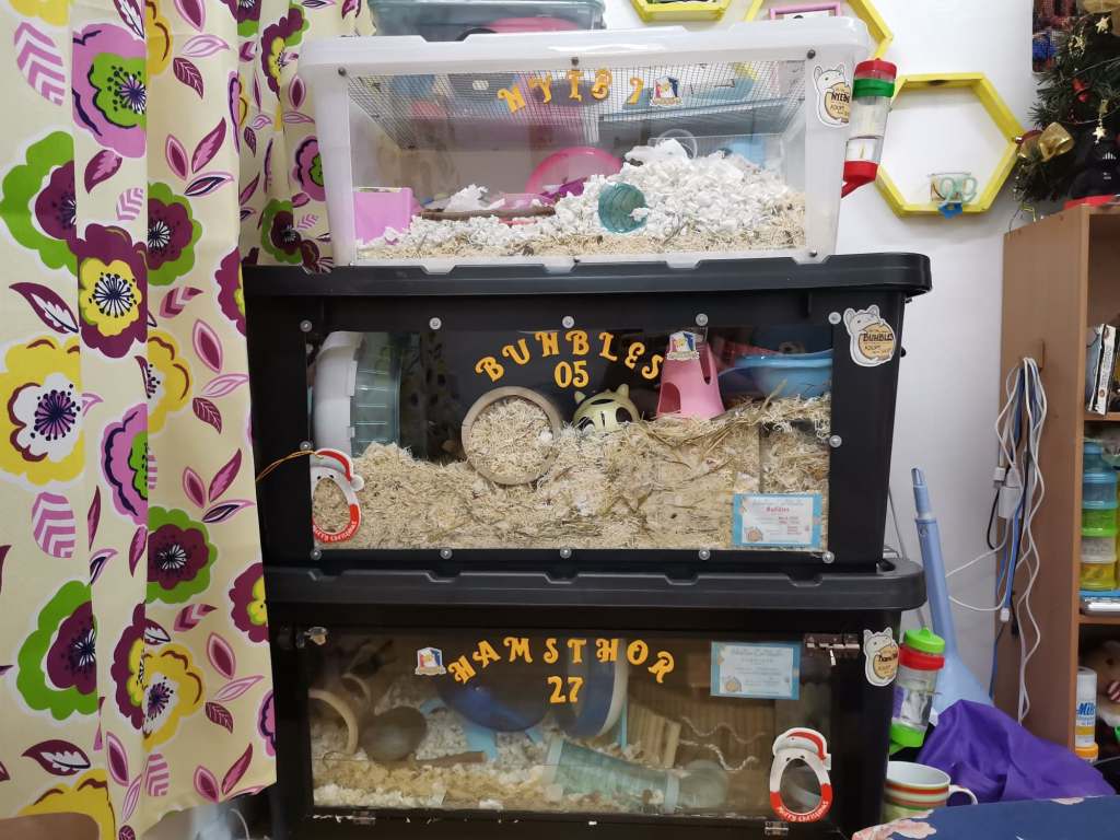 And that’s where it began, I searched on facebook and joined some HAMSTER group, until I saw some post about PHK , I clicked their page and I read their Mission. It captures my heart and messaged their page right away. I was so excited but.. the requirements is not that easy, I lived in a small apartment and I was thinking where will I place it. I tried fixing my place so that I have enough space for my hamster. I was being impulsive that time because of emotional problems at work and need some stress reliever. I thought having a hamster is just easy, just place them in a small cage , add some wheel food and water and that’s it, I also thought that I need pairs for them not to be lonely. But When i joined PHK group chat V3, I learned a lot about hamster keeping. I understand why they need bigger cage, deeper beddings , food mixes and why is breeding is NOT tolerated ,etc. and when the day comes that I’ll be getting my first hamster, a rex CDH 2months old named THOR (HamsTHOR) , I knew that it was love at first sight when I saw my very first baby hamster. Taming is a no joke, it takes time and effort and pain (if they bite you hehe) but PHK is there to guide me as a beginner HAM-MOM. I did some research and everything, and after a month, I adopted BUHBLES , a 4 months old syrian hamster, the one that PHK rescued and had a mass removal surgery. I was afraid to touched her that time. Taming process really challenged me but I tried everyday and didn’t give up. And lastly, I adopted a Winterwhite 1 month old named NYEBIE (came from the word NYEBE = snow). Every hamsters has different personality which challenged me how to interact with them. What I love also being a HAM-MOM is , they are like a Kid that has their own favorite toys, favorite treatoo , don’ t like this and that which makes them different and unique with one another.